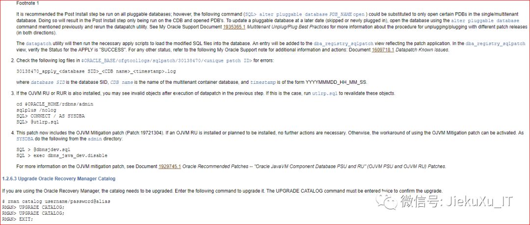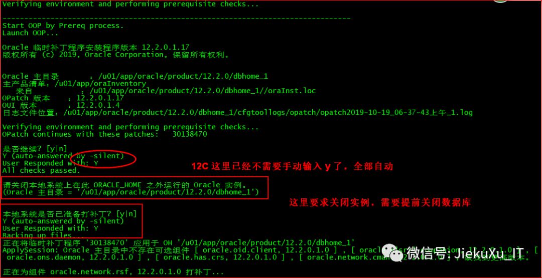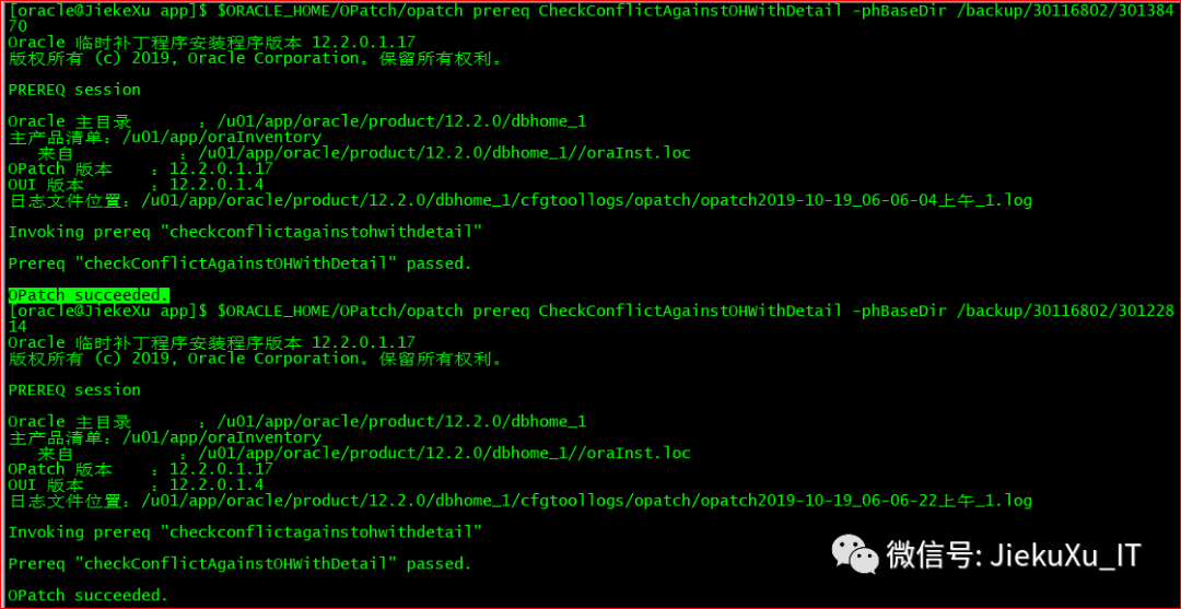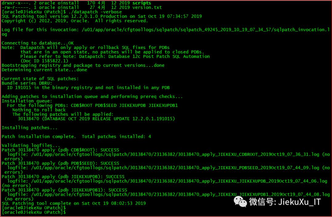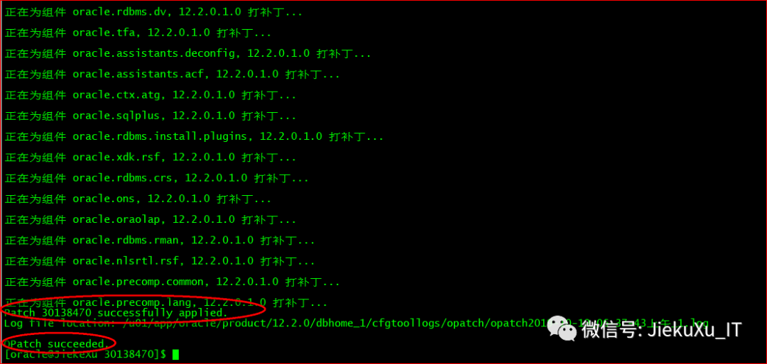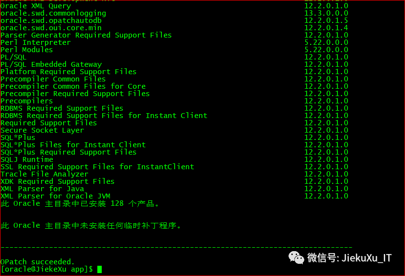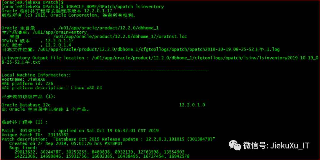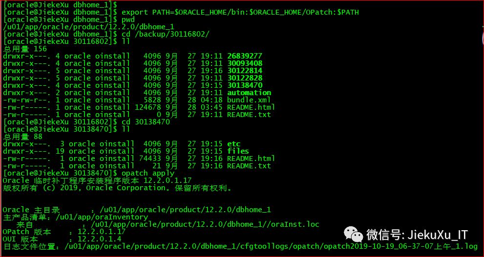 [oracle@JiekeXu 30116802]$ exportPATH=$ORACLE_HOME/bin:$ORACLE_HOME/OPatch:$PATH[oracle@JiekeXu 30116802]$ cd backup/30116802/30138470[oracle@JiekeXu 30138470]$ ll总用量 88drwxr-x---. 3 oracle oinstall 4096 9月 27 19:15 etcdrwxr-x---. 19 oracle oinstall 4096 9月 27 19:15 files-rw-r-----. 1 oracle oinstall 74433 9月 27 19:16 README.html-rw-r-----. 1 oracle oinstall 21 9月 27 19:16 README.txt[oracle@JiekeXu 30138470]$ opatch apply
