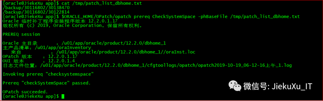 [oracle@JiekeXu app]$ cat tmp/patch_list_dbhome.txt/backup/30116802/30138470/backup/30116802/30122814$ORACLE_HOME/OPatch/opatch prereq CheckSystemSpace -phBaseFile tmp/patch_list_dbhome.txt