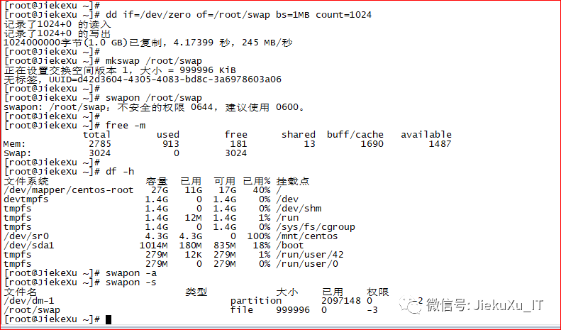 [root@JiekeXu ~]# free -mtotal used free shared buff/cache availableMem: 2785 913 113 13 1758 1484Swap: 2047 0 2047从 / 下分出 1G 的空间作为 swap 使用[root@JiekeXu ~]# dd if=/dev/zero of=/root/swap bs=1MB count=1024记录了1024+0 的读入记录了1024+0 的写出1024000000字节(1.0 GB)已复制,4.17399 秒,245 MB/秒[root@JiekeXu ~]#[root@JiekeXu ~]# mkswap /root/swap #格式化正在设置交换空间版本 1,大小 = 999996 KiB无标签,UUID=d42d3604-4305-4083-bd8c-3a6978603a06[root@JiekeXu ~]#[root@JiekeXu ~]# swapon /root/swap #激活 swapswapon: /root/swap:不安全的权限 0644,建议使用 0600。[root@JiekeXu ~]#[root@JiekeXu ~]# free -mtotal used free shared buff/cache availableMem: 2785 913 181 13 1690 1487Swap: 3024 0 3024