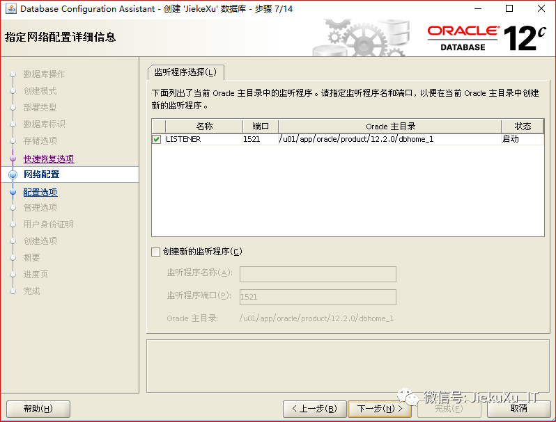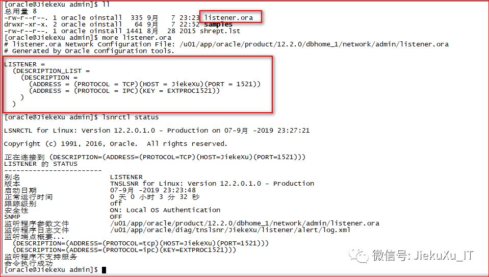 [oracle@JiekeXu admin]$ more listener.ora# listener.ora Network Configuration File: /u01/app/oracle/product/12.2.0/dbhome_1/network/admin/listener.ora# Generated by Oracle configuration tools.LISTENER =(DESCRIPTION_LIST =(DESCRIPTION =(ADDRESS = (PROTOCOL = TCP)(HOST = JiekeXu)(PORT = 1521))(ADDRESS = (PROTOCOL = IPC)(KEY = EXTPROC1521))))