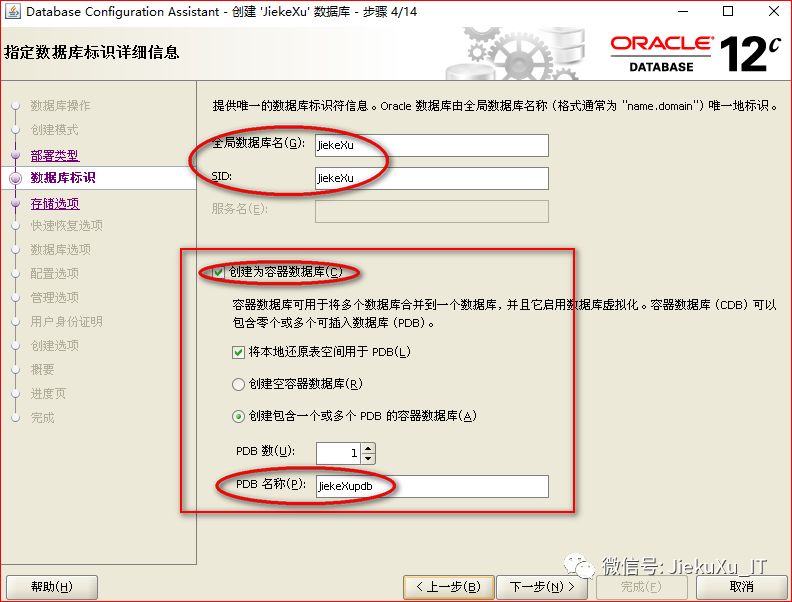 这里需要勾选如下图中所示的“创建为容器数据库”