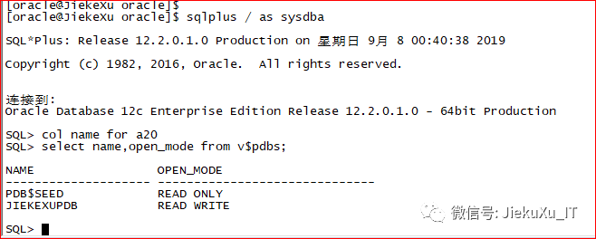 [oracle@JiekeXu oracle]$ sqlplus / as sysdbaSQL*Plus: Release 12.2.0.1.0 Production on 星期日 9月 8 00:40:38 2019Copyright (c) 1982, 2016, Oracle. All rights reserved.连接到:Oracle Database 12c Enterprise Edition Release 12.2.0.1.0 - 64bit ProductionSQL> col name for a20SQL> select name,open_mode from v$pdbs;NAME OPEN_MODE-------------------- ------------------------------PDB$SEED READ ONLYJIEKEXUPDB READ WRITE