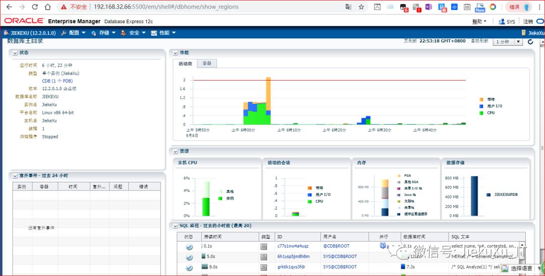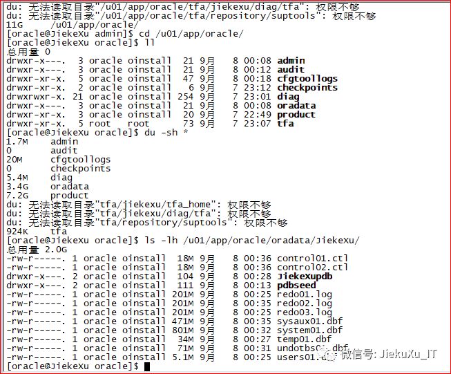 [oracle@JiekeXu admin]$ df -h文件系统 容量 已用 可用 已用% 挂载点/dev/mapper/centos-root 27G 21G 6.3G 78% /devtmpfs 1.4G 0 1.4G 0% /devtmpfs 1.4G 484M 909M 35% /dev/shmtmpfs 1.4G 12M 1.4G 1% /runtmpfs 1.4G 0 1.4G 0% /sys/fs/cgroup/dev/sr0 4.3G 4.3G 0 100% /mnt/centos/dev/sda1 1014M 180M 835M 18% /boottmpfs 279M 12K 279M 1% /run/user/42tmpfs 279M 0 279M 0% /run/user/0[oracle@JiekeXu admin]$ free -mtotal used free shared buff/cache availableMem: 2785 826 490 489 1467 1170Swap: 3024 48 2976[oracle@JiekeXu admin]$ cd /u01/app/oracle/[oracle@JiekeXu oracle]$ ll总用量 0drwxr-x---. 3 oracle oinstall 21 9月 8 00:08 admindrwxr-x---. 3 oracle oinstall 21 9月 8 00:12 auditdrwxr-xr-x. 5 oracle oinstall 47 9月 8 00:18 cfgtoollogsdrwxr-xr-x. 2 oracle oinstall 6 9月 7 23:12 checkpointsdrwxrwxr-x. 21 oracle oinstall 254 9月 7 23:01 diagdrwxr-x---. 3 oracle oinstall 21 9月 8 00:08 oradatadrwxr-xr-x. 3 oracle oinstall 20 9月 7 22:49 productdrwxr-xr-x. 5 root root 73 9月 7 23:07 tfa[oracle@JiekeXu oracle]$ du -sh *1.7M admin0 audit20M cfgtoollogs0 checkpoints5.4M diag3.4G oradata7.2G product[oracle@JiekeXu oracle]$ ls -lh /u01/app/oracle/oradata/JiekeXu/总用量 2.0G-rw-r-----. 1 oracle oinstall 18M 9月 8 00:36 control01.ctl-rw-r-----. 1 oracle oinstall 18M 9月 8 00:36 control02.ctldrwxr-x---. 2 oracle oinstall 104 9月 8 00:28 JiekeXupdbdrwxr-x---. 2 oracle oinstall 111 9月 8 00:13 pdbseed-rw-r-----. 1 oracle oinstall 201M 9月 8 00:25 redo01.log-rw-r-----. 1 oracle oinstall 201M 9月 8 00:35 redo02.log-rw-r-----. 1 oracle oinstall 201M 9月 8 00:25 redo03.log-rw-r-----. 1 oracle oinstall 471M 9月 8 00:35 sysaux01.dbf-rw-r-----. 1 oracle oinstall 801M 9月 8 00:32 system01.dbf-rw-r-----. 1 oracle oinstall 34M 9月 8 00:27 temp01.dbf-rw-r-----. 1 oracle oinstall 71M 9月 8 00:31 undotbs01.dbf-rw-r-----. 1 oracle oinstall 5.1M 9月 8 00:25 users01.dbf