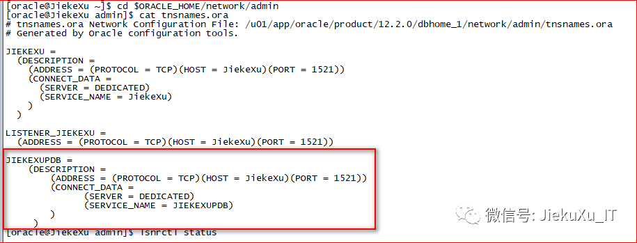 [oracle@JiekeXu ~]$ cd $ORACLE_HOME/network/admin[oracle@JiekeXu admin]$ cat tnsnames.ora# tnsnames.ora Network Configuration File: /u01/app/oracle/product/12.2.0/dbhome_1/network/admin/tnsnames.ora# Generated by Oracle configuration tools.JIEKEXU =(DESCRIPTION =(ADDRESS = (PROTOCOL = TCP)(HOST = JiekeXu)(PORT = 1521))(CONNECT_DATA =(SERVER = DEDICATED)(SERVICE_NAME = JiekeXu)))LISTENER_JIEKEXU =(ADDRESS = (PROTOCOL = TCP)(HOST = JiekeXu)(PORT = 1521))JIEKEXUPDB =(DESCRIPTION =(ADDRESS = (PROTOCOL = TCP)(HOST = JiekeXu)(PORT = 1521))(CONNECT_DATA =(SERVER = DEDICATED)(SERVICE_NAME = JIEKEXUPDB)))