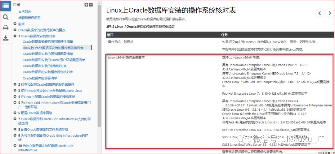 oracle 自己也有一份很详细的安装文档可在线查看或下载,例如下,数据库 12.2.0.1 对操作系统版本有严格要求, Red Hat Enterprise Linux 6.4: 2.6.32-358.el6.x86_64 or later、 Red Hat Enterprise Linux 7: 3.10.0-123.el7.x86_64 or later 等等。