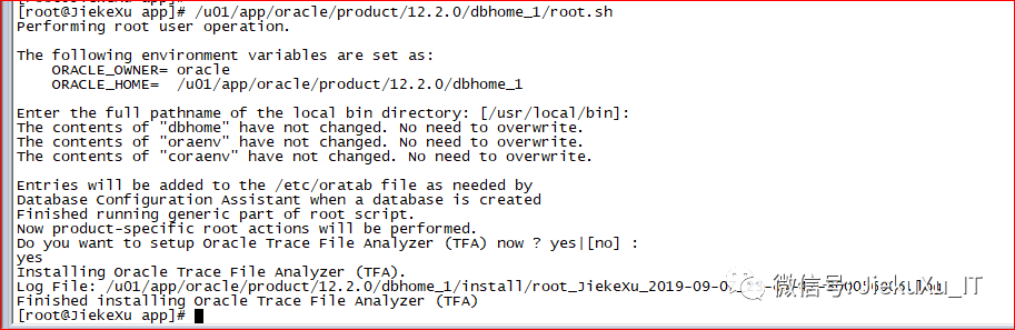 [root@JiekeXu app]# /u01/app/oracle/product/12.2.0/dbhome_1/root.shPerforming root user operation.The following environment variables are set as:ORACLE_OWNER= oracleORACLE_HOME= /u01/app/oracle/product/12.2.0/dbhome_1Enter the full pathname of the local bin directory: [/usr/local/bin]:Copying dbhome to /usr/local/bin ...Copying oraenv to /usr/local/bin ...Copying coraenv to /usr/local/bin ...Creating /etc/oratab file...Entries will be added to the /etc/oratab file as needed byDatabase Configuration Assistant when a database is createdFinished running generic part of root script.Now product-specific root actions will be performed.Do you want to setup Oracle Trace File Analyzer (TFA) now ? yes|[no] :Oracle Trace File Analyzer (TFA - User Mode) is available at :/u01/app/oracle/product/12.2.0/dbhome_1/suptools/tfa/release/tfa_home/bin/tfactlOROracle Trace File Analyzer (TFA - Daemon Mode) can be installed by running this script :/u01/app/oracle/product/12.2.0/dbhome_1/suptools/tfa/release/tfa_home/install/roottfa.sh/u01/app/oracle/product/12.2.0/dbhome_1/rdbms/install/rootadd_rdbms.sh: 第 79 行:[: 6815744: 期待二元表达式/u01/app/oracle/product/12.2.0/dbhome_1/rdbms/install/rootadd_rdbms.sh: 第 79 行:[: 参数太多/u01/app/oracle/product/12.2.0/dbhome_1/rdbms/install/rootadd_rdbms.sh: 第 88 行:[: 6815744: 期待一元表达式[root@JiekeXu app]# /u01/app/oracle/product/12.2.0/dbhome_1/root.shPerforming root user operation.The following environment variables are set as:ORACLE_OWNER= oracleORACLE_HOME= /u01/app/oracle/product/12.2.0/dbhome_1Enter the full pathname of the local bin directory: [/usr/local/bin]:The contents of "dbhome" have not changed. No need to overwrite.The contents of "oraenv" have not changed. No need to overwrite.The contents of "coraenv" have not changed. No need to overwrite.Entries will be added to the /etc/oratab file as needed byDatabase Configuration Assistant when a database is createdFinished running generic part of root script.Now product-specific root actions will be performed.Do you want to setup Oracle Trace File Analyzer (TFA) now ? yes|[no] :yesInstalling Oracle Trace File Analyzer (TFA).Log File: /u01/app/oracle/product/12.2.0/dbhome_1/install/root_JiekeXu_2019-09-07_23-05-47-800056905.logFinished installing Oracle Trace File Analyzer (TFA)[root@JiekeXu app]#