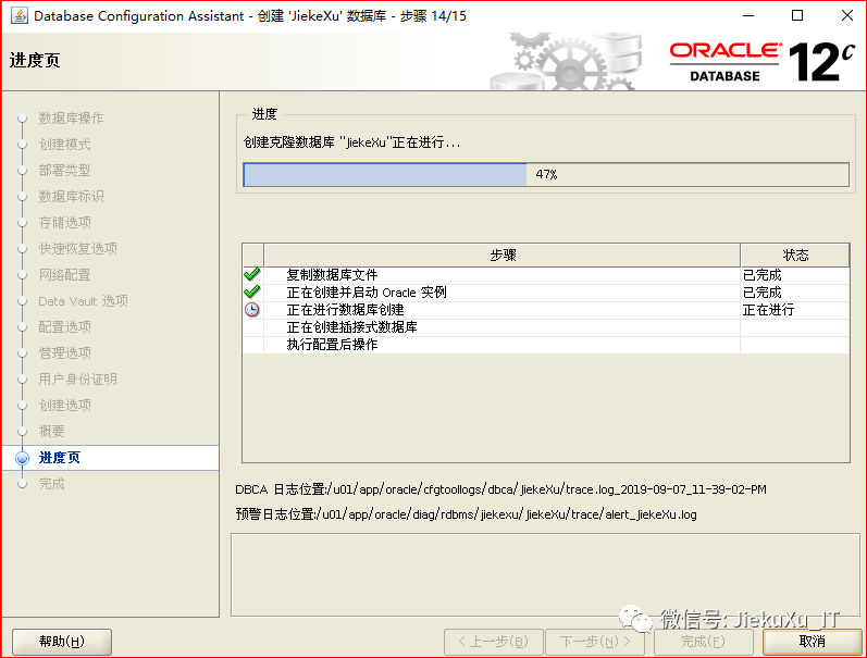 点击完成,则会出现如下进度条进行数据库实例的创建。到 47% 时间比较久,耐心等待即可。