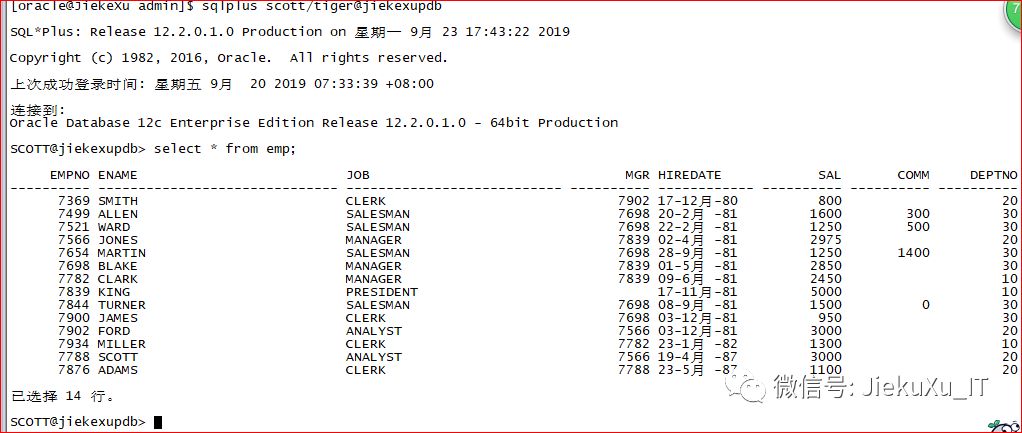[oracle@JiekeXu ~]$ cd $ORACLE_HOME/rdbms/admin/[oracle@JiekeXu admin]$ cp utlsampl.sql utlsampl2.sql[oracle@JiekeXu admin]$ vi utlsampl2.sqlCONNECT SCOTT/tiger@JIEKEXUPDB #找到这一行,写上自己上面 tns 中配置的服务名SYS@JIEKEXUPDB> @?/rdbms/admin/utlsampl2.sql[oracle@JiekeXu admin]$ sqlplus scott/tiger@JIEKEXUPDB