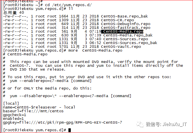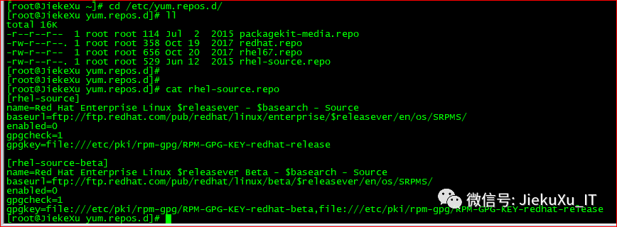 [root@JiekeXu ~]# cd etc/yum.repos.d/[root@JiekeXu yum.repos.d]# lltotal 16K-r--r--r-- 1 root root 114 Jul 2 2015 packagekit-media.repo-rw-r--r--. 1 root root 358 Oct 19 2017 redhat.repo-rw-r--r-- 1 root root 656 Oct 20 2017 rhel64.repo-rw-r--r--. 1 root root 529 Jun 12 2015 rhel-source.repo[root@JiekeXu yum.repos.d]#