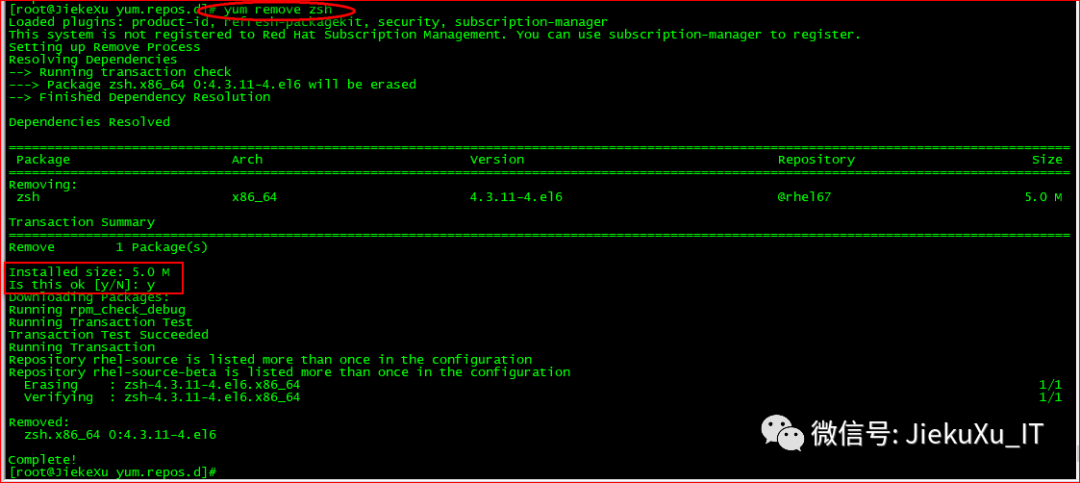 [root@JiekeXu yum.repos.d]# yum install zsh[root@JiekeXu yum.repos.d]# yum info zsh[root@JiekeXu yum.repos.d]# yum remove zsh