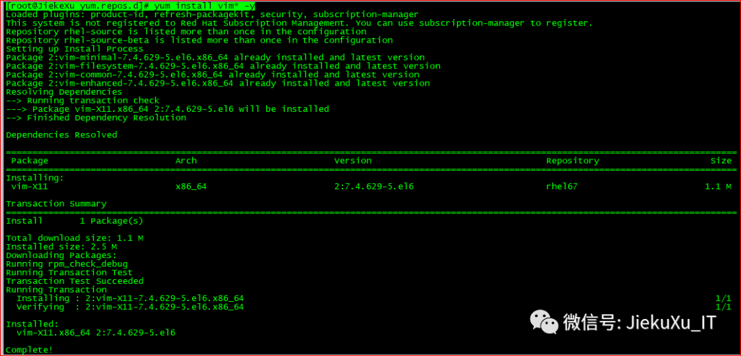[root@JiekeXu yum.repos.d]# yum install vim* -y[root@JiekeXu yum.repos.d]# yum install x11*Loaded plugins: product-id, refresh-packagekit, security, subscription-managerThis system is not registered to Red Hat Subscription Management. You can use subscription-manager to register.Repository rhel-source is listed more than once in the configurationRepository rhel-source-beta is listed more than once in the configurationSetting up Install ProcessResolving Dependencies--> Running transaction check---> Package xorg-x11-apps.x86_64 0:7.7-6.el6 will be installed--> Finished Dependency Resolution