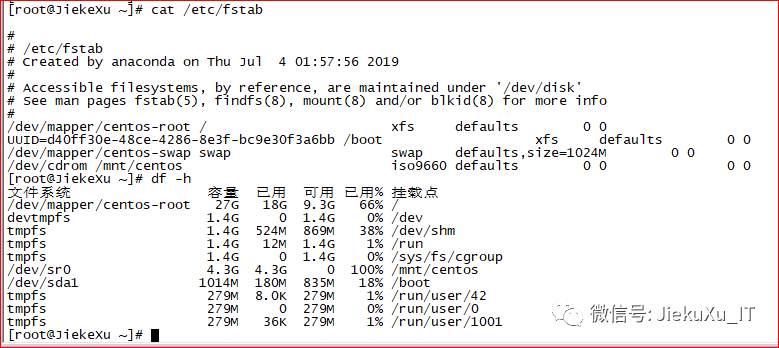 /dev/cdrom /mnt/contos iso9660 defaults 0 0 0 0[root@JiekeXu sysconfig]# cat /etc/fstab# /etc/fstab# Created by anaconda on Thu Jul 4 01:57:56 2019## Accessible filesystems, by reference, are maintained under '/dev/disk'# See man pages fstab(5), findfs(8), mount(8) and/or blkid(8) for more info#/dev/mapper/centos-root / xfs defaults 0 0UUID=d40ff30e-48ce-4286-8e3f-bc9e30f3a6bb /boot xfs defaults 0 0/dev/mapper/centos-swap swap swap defaults,size=1024M 0 0/dev/cdrom /mnt/centos iso9660 defaults 0 0 0 0