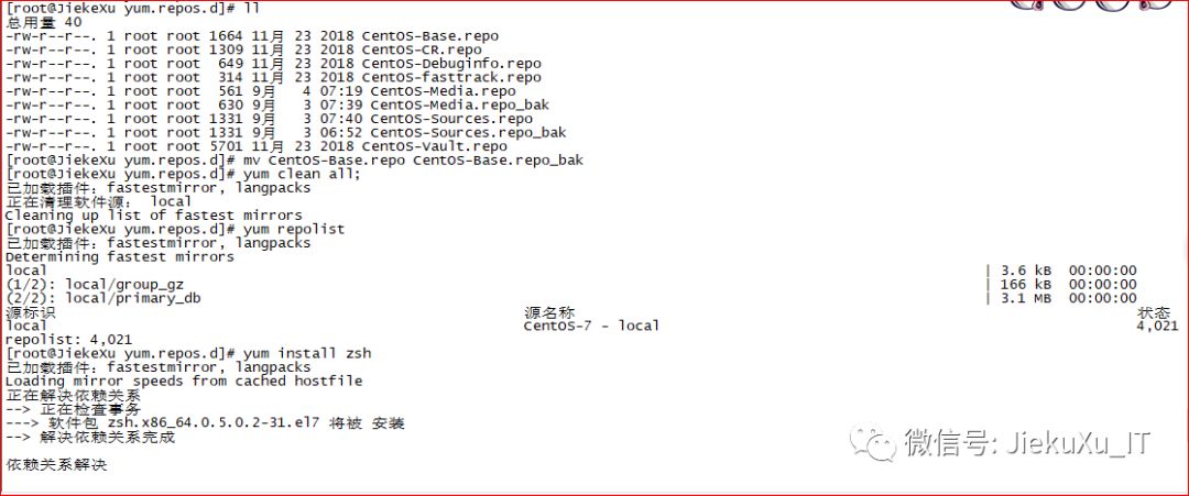 清空缓存 yum clean all查看可用 yum 源 yum repolist[root@JiekeXu yum.repos.d]# yum clean all;已加载插件:fastestmirror, langpacks正在清理软件源:localCleaning up list of fastest mirrors[root@JiekeXu yum.repos.d]# yum repolist已加载插件:fastestmirror, langpacksDetermining fastest mirrorslocal | 3.6 kB 00:00:00(1/2): local/group_gz | 166 kB 00:00:00(2/2): local/primary_db | 3.1 MB 00:00:00源标识 源名称 状态local CentOS-7 - local 4,021repolist: 4,021