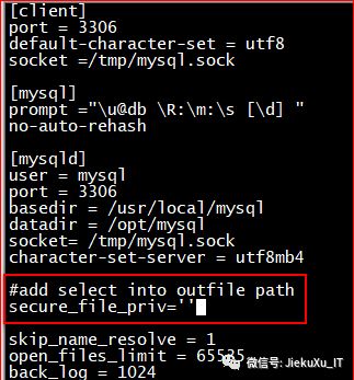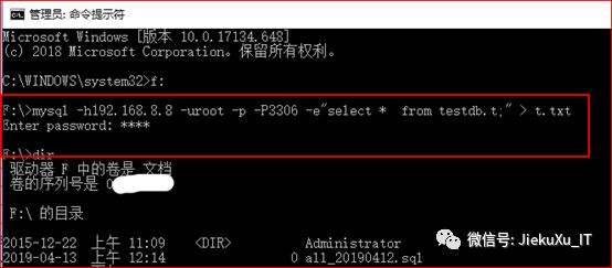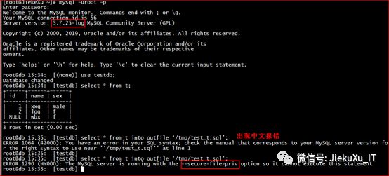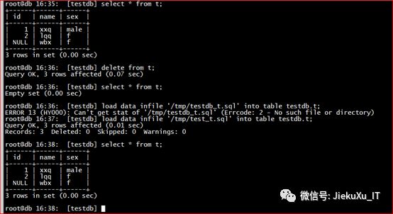 root@db 16:20: [(none)] usetestdb;Database changedroot@db 16:23: [testdb] select *from t into outfile ‘/tmp/test_t.sql’;Query OK, 3 rows affected (0.01 sec)root@db 16:24: [testdb]#查看导出数据[root@JiekeXu tmp]# more test_t.sql1 xxq male2 lqq f\N wbx f
