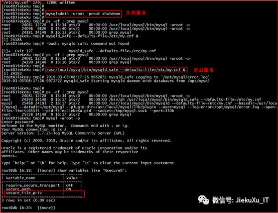 [root@JiekeXu tmp]# mysqladmin -uroot -proot shutdown[root@JiekeXu tmp]#[root@JiekeXu tmp]# ps -ef | grep mysqlroot 24081 12728 0 15:34 pts/0 00:00:00 usr/local/mysql/bin/mysql -uroot -proot 24096 9826 0 15:40 pts/1 00:00:00 usr/local/mysql/bin/mysql -uroot -proot 24181 14148 0 16:13 pts/2 00:00:00 grep mysql[root@JiekeXu tmp]# /usr/local/mysql/bin/mysqld_safe --defaults-file=/etc/my.cnf &[1] 24193[root@JiekeXu tmp]# 2019-03-05T08:17:26.966287Z mysqld_safe Logging to ‘/opt/mysql/error.log’.2019-03-05T08:17:26.997172Z mysqld_safe Starting mysqld daemon with databases from opt/mysql[root@JiekeXu tmp]#[root@JiekeXu tmp]# ps -ef | grep mysqlroot 24081 12728 0 15:34 pts/0 00:00:00 usr/local/mysql/bin/mysql -uroot -proot 24193 14148 0 16:17 pts/2 00:00:00 bin/sh usr/local/mysql/bin/mysqld_safe --defaults-file=/etc/my.cnfmysql 25488 24193 2 16:17 pts/2 00:00:00 usr/local/mysql/bin/mysqld --defaults-file=/etc/my.cnf --basedir=/usr/local/mysql --datadir=/opt/mysql --plugin-dir=/usr/local/mysql/lib/plugin --user=mysql –log-error=/opt/mysql/error.log --open-files-limit=65535 --pid-file=JiekeXu.pid --socket=/tmp/mysql.sock --port=3306root 25528 14148 0 16:17 pts/2 00:00:00 grep mysql