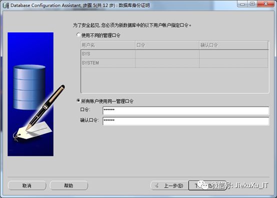 l 设置口令,这里“所有账户使用同一管理口令”,口令是“system”,根据个人喜好定,下一步