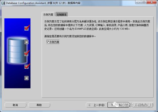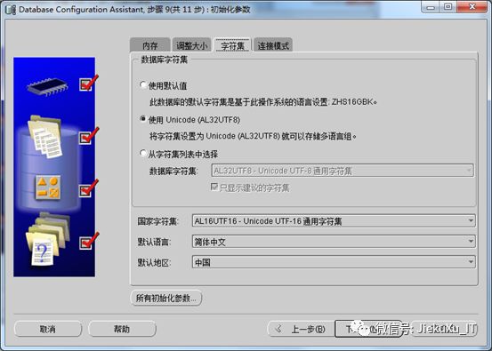 l 字符集,默认是zhs16gbk,这里选“使用Unicode(AL32UTF8)”,根据情况定,一旦选定以后很难更改。下一步