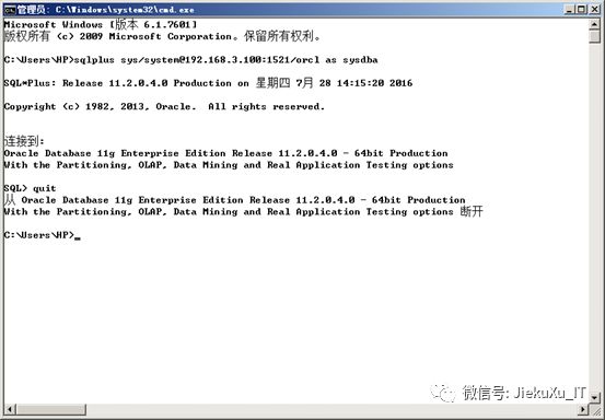sqlplus sys/system@192.168.3.100:1521/orclas sysdba