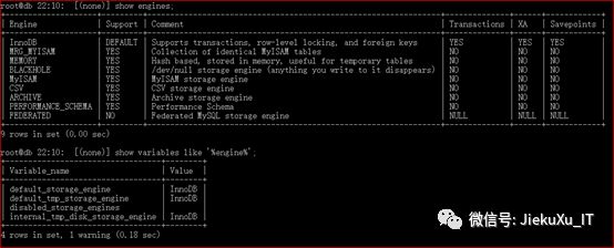 root@db22:10: [(none)] show engines; #查看数据库存储引擎+--------------------+---------+----------------------------------------------------------------+--------------+------+------------+|Engine | Support |Comment | Transactions | XA | Savepoints |+--------------------+---------+----------------------------------------------------------------+--------------+------+------------+|InnoDB | DEFAULT | Supportstransactions, row-level locking, and foreign keys | YES | YES | YES ||MRG_MYISAM | YES | Collection of identical MyISAMtables | NO | NO | NO ||MEMORY | YES | Hash based, stored in memory, useful fortemporary tables | NO | NO | NO ||BLACKHOLE | YES | dev/null storage engine (anything youwrite to it disappears) | NO |NO | NO ||MyISAM | YES | MyISAM storage engine |NO | NO | NO ||CSV | YES | CSV storage engine |NO | NO | NO ||ARCHIVE | YES | Archive storage engine |NO | NO | NO ||PERFORMANCE_SCHEMA | YES |Performance Schema |NO | NO | NO ||FEDERATED | NO | Federated MySQL storage engine | NULL | NULL | NULL |+--------------------+---------+----------------------------------------------------------------+--------------+------+------------+9 rowsin set (0.00 sec)root@db22:10: [(none)] show variables like'%engine%'; #查看数据库默认存储引擎+----------------------------------+--------+|Variable_name |Value |+----------------------------------+--------+|default_storage_engine | InnoDB||default_tmp_storage_engine | InnoDB||disabled_storage_engines | ||internal_tmp_disk_storage_engine | InnoDB |+----------------------------------+--------+4 rowsin set, 1 warning (0.18 sec)