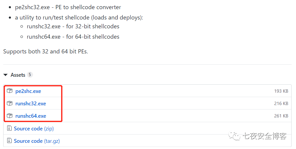这个项目有趣的地方是 将exe转化为shellcode,转化后的文件依然是完整的PE文件,不仅可以单独运行,也可以通过shellcode的方式运行。在项目的release页面,根据自身的系统下载runshc 和pe2shc文件: