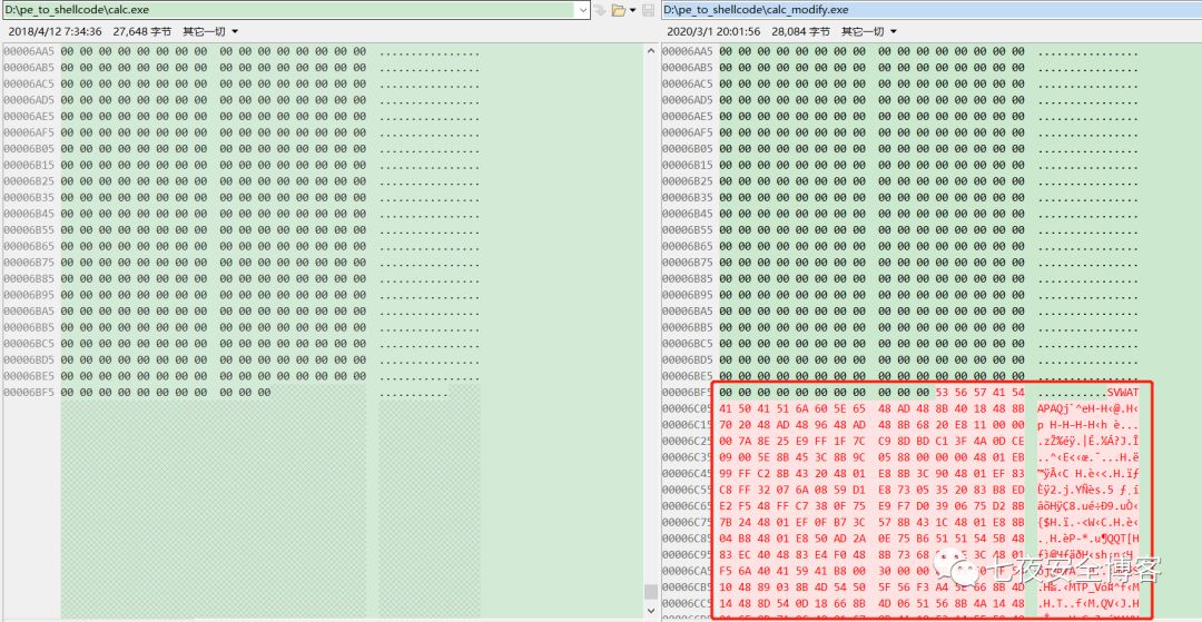 想知道原理,最直观的方式是比对calc.exe 与calc_modify.exe的二进制内容,看一下有哪些不同。
