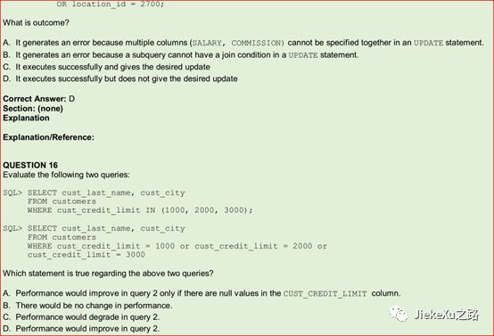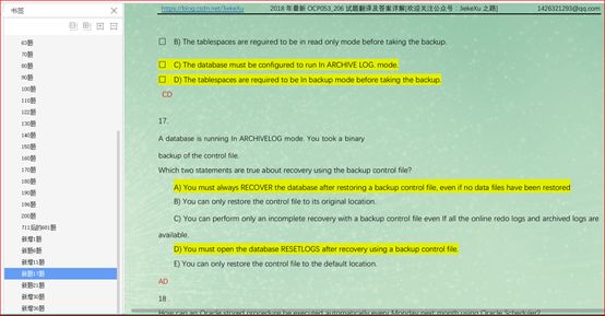我将考试过程中收集和整理的资料准备打成了一个压缩包(明天发出),【JiekeXu之路】公众号后台回复【ocp】即可获取,资源中包含了您考取OCP11g中所需要的几乎所有的考试资料!不用到处找琐碎的资料!一次搞定!包括最新的1Z0-071、1Z0-052、1Z0-053PDF版本以及1Z0-051、1Z0-052、1Z0-053的PDF版本题库(英文原版)和整合翻译版(对大多数题的题干和正确答案进行了翻译和关键词高亮显示,方便记忆,翻译材料整理自网络共享文档和本人手工有道的补充)、VCE模拟测试软件、三科对应的VCE题库(包含053中206和711两个版本的)如无参考价值可忽略,目前公众号也很少有人备考OCP,发出来以供后人参考。祝大家考试顺利通过!!!