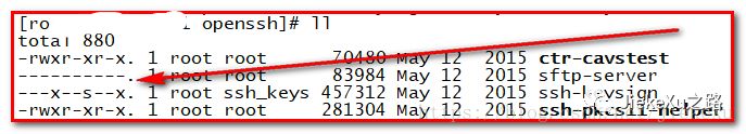 看到/usr/libexec/openssh/sftp-server文件的权限变成了000,这样和默认的有出入啊,这就是无法建立sftp会话的原因。一看不对劲啊,这不合适,不要想着是谁干的了,就马上想到了chmod 775 sftp-server,立刻来一打这命令呗,可是出乎意料发现报错了,没有权限啊。怎么整?放大招呗,在Linux ext文件系统中,权限控制除了常规的chmod,还会有文件属性管理,故出现了chattr命令。