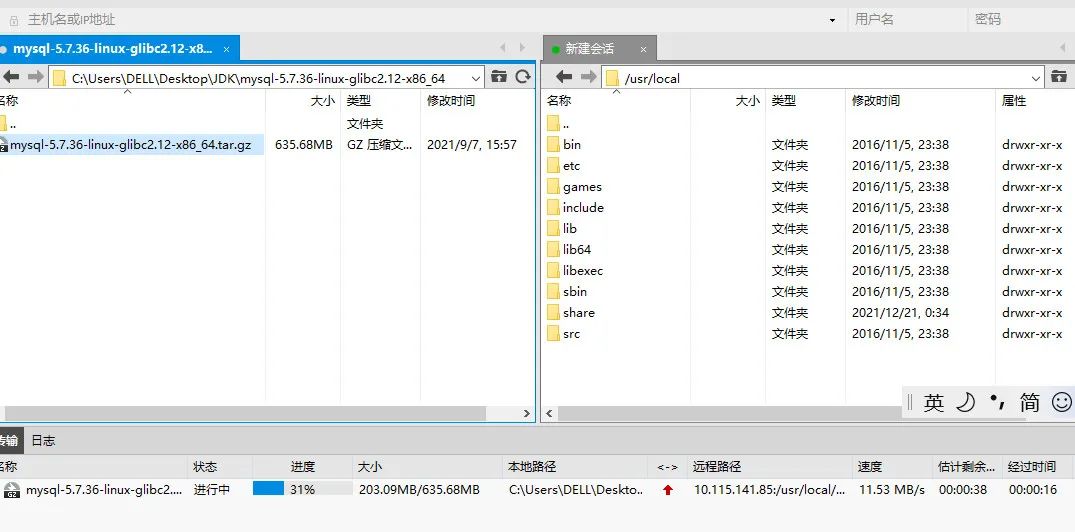 2、上传mysql-5.7.36-linux-glibc2.12-x86_64.tar.gz到服务器/usr/local目录