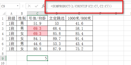 =SUMPRODUCT(1/COUNTIF(C2:C7,C2:C7))