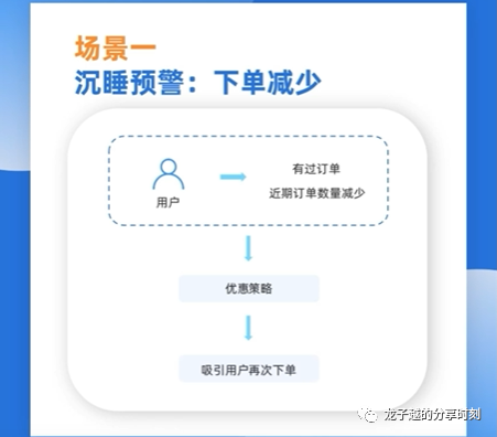 我们可以圈选过去一段时间内产生过订单,但近期订单数量减少了用户,然后通过一些优惠手段吸引用户再次下单。比如:在过去30天内,小明在京东买菜上有过5次订单,但最近两周小明确薅其他平台的羊毛了,所以在叮咚买菜上只产生了一次订单,这时就可以通过短信和公众号消息等方式给产品推送10元优惠券或者满减优惠券,吸引他再次下单。