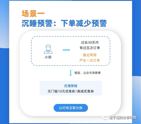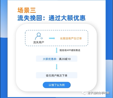 针对流失用户,假设流失原因可能是消费动力不足,那么我们可以通过大额优惠尝试挽回,比如:外卖平台“饿了吗”,对于长期没有产生订单的用户,会以短信或者APP通知的方式推送大额优惠券,吸引用户下单,例如:满20减10的限时优惠,这种情况下就有较大可能挽回用户。