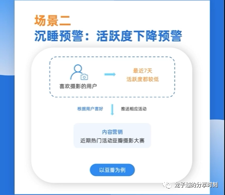 当用户最近一段时间的活跃度有所下降,并且低到了一定数值为了提高用户活跃度,可以通过一系列内容营销来激活用户。比如:豆瓣上某个喜欢摄影的用户,在最近7天活跃度都低于一定数值,针对这种情况,平台就可以根据用户的喜好推送相应的活动。比如:近期热门活动,豆瓣摄影大赛