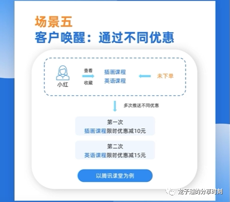 这个方法是指针对一定时间内未下单的用户,可以通过多次推送优惠券的方式进行唤醒,而每次推送的优惠券,都针对不同商品。以腾讯课堂为例,小红的历史行为数据显示,他曾查看并收藏了插画课程和英语课程,但均未下单购买,那么就可以多次给小红推送不同课程的优惠,第一次推送插画课程限时优惠减10元,第二次可以推送英语课程限时优惠减15元,针对他的不同需求推送对应的优惠活动,就更有可能唤醒用户。