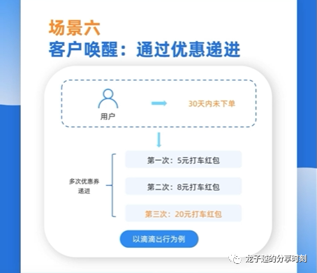 同样是针对一定时间内未下单的用户,除了多次推送不同商品优惠券这种方法,还可以通过多次优惠券递进的方式进行唤醒,每次推送增加优惠力度,比如滴滴出行就会使用这种方法,针对30天内未下单的用户,第一次推送5元打车红包,第二次推送8元打车红包,而在两次都没有唤醒用户的情况下,第三次就可以给用户推送20元的打车红包,有了前两次的优惠对比,第三次优惠力度更大,唤醒用户的可能性就更高。