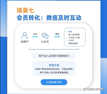新用户关注公众号后,48小时内给用户发信息的次数没有限制,我们可以多加利用这一点,此时引导用户加入会员转化率往往会比较高。比如:优衣库的公众号在关注之后,系统会自动发送打招呼消息,告诉用户,加入会员可以领取10元新人礼券,同时弹出领券的小程序,此时用户被引导加入会的可能性就更大。需要注意的是给用户推送消息的时间不能过长,时间过长可能会降低用户对加入会员的优惠敏感度。