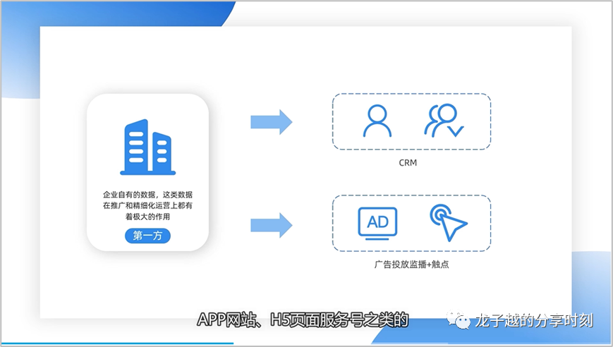 那么下面我们就来详细说一说这三类数据的区别是什么?第一方,数据很容易理解,你企业自己的数据就是第一方数据,但是企业自己数据那么多,究竟哪一块数据才是有用的?第一方数据主要来自于两块,第一块是来自于CRM这一块,大家都已经比较熟悉了,你的客户和意向客户数据都会放在CRM里面,这个数据可宝贵了,里面都是一些你最核心的人群。第二块主要来自广告投放的监播,还有广告流量进入到的落地环节,这些落地环节被称为触点,触点其实就是指你自己所拥有的小程序,APP网站、h5页面服务号之类的,跟消费者能够发生更进一步交互的平台。