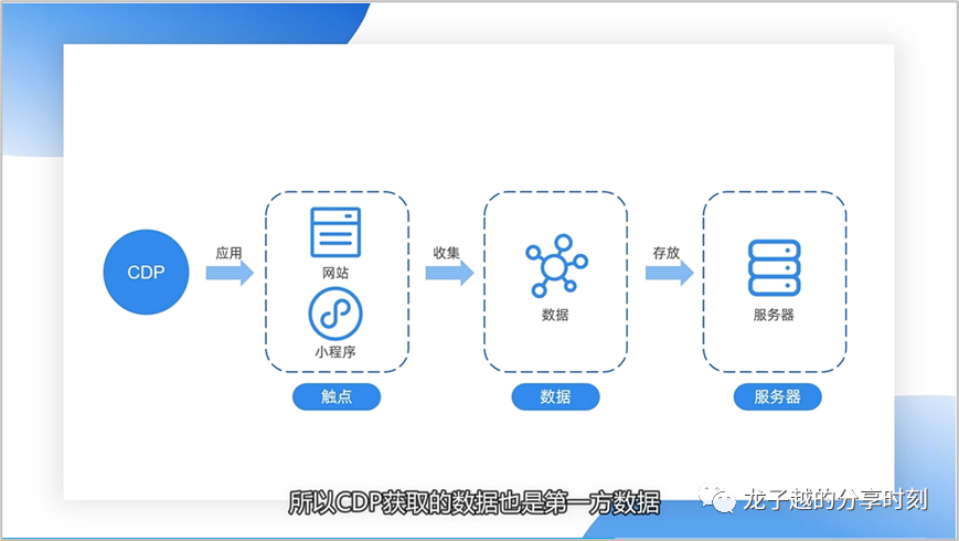 接下来大家可以思考一个问题,假设你用秒针的监测所监测到投放广告之后获得的数据,这是属于定型化数据,答案是第一方数据,这个数据虽然是秒针给你监测的,但也是你的数据。同样利用谷歌分析或者百度统计监测到的相关数据也是你的,这都是第一方数据。当然还有一些不典型的第一方数据,比如在你网站上的用户行为数据,这些数据你可以用谷歌分析或者百度统计进行监测,而今天我们在获取第一方数据时,还有一个很重要的工具,在一定程度上去替代谷歌分析和百度统计,这个工具就是CDP,我们把CDP用在我们的网站小程序的处理上,他能帮我们直接收到数据并存在我们的服务器中,所以CDP获取的数据也是第一方数据。