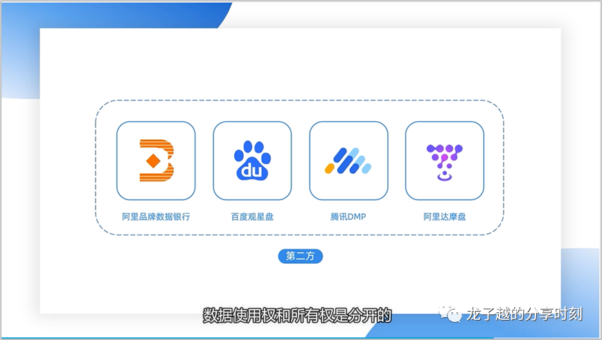 第二方数据是什么?第二方数据一般指的是跟我们有合作关系,媒体的数据。举一个例子,比如说阿里的数据对我们来说就是第二方数据,如果你有阿里品牌数据银行的账号,你就能知道某个特定人群的特征,但不能知道他们个体的数据,你也不能将里面的数据导出来,所以虽然你有账号,但阿里品牌数据银行的数据仍然不是你拥有的,同样像百度的观星盘,腾讯DMP、阿里的达摩盘都是属于第二方数据,这些数据只允许你用,但不能获得数据使用权和所有权是分开的。