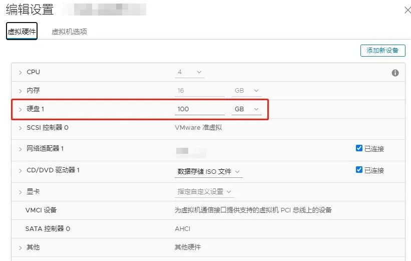 原先磁盘为50G,因为存储不够需要扩容,虚拟机关机增加硬盘至100G后开机,后续我们要把增加的50G扩容至根(“/”)目录下。打开虚拟机