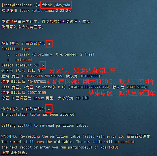 注释:使用Linux的fdisk分区工具给磁盘/dev/sda分区,也可以根据提示输入m查看帮助信息,再输入n(表示增加分区)