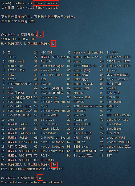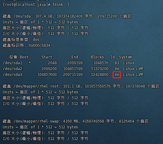 fdisk -l 看到/dev/sda3的Id号为83,我们要将其改成8e(LVM卷文件系统的Id),具体方法同上根上部中的磁盘分区大同小异