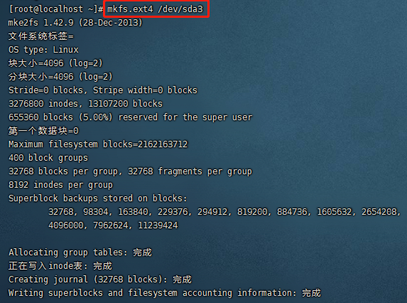 我们可以根据提示指定start值为104857600(或直接回车默认),end值为默认即可(即当前最大值),回车后输入W进行保存,分区划分完毕。
