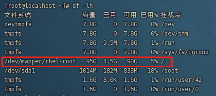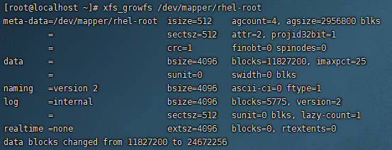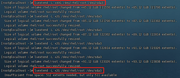 把VG中多余的空间添加到/dev/rhel/root 中,可以多次加入直到不能再添加。