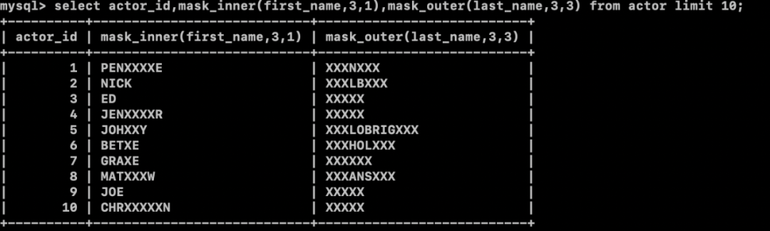 数据屏蔽与去识别功能,可以实现屏蔽部分敏感信息的功能,例如:使用mask_inner()和mask_outer()函数将字符串内部/外部的敏感信息用“X”屏蔽。