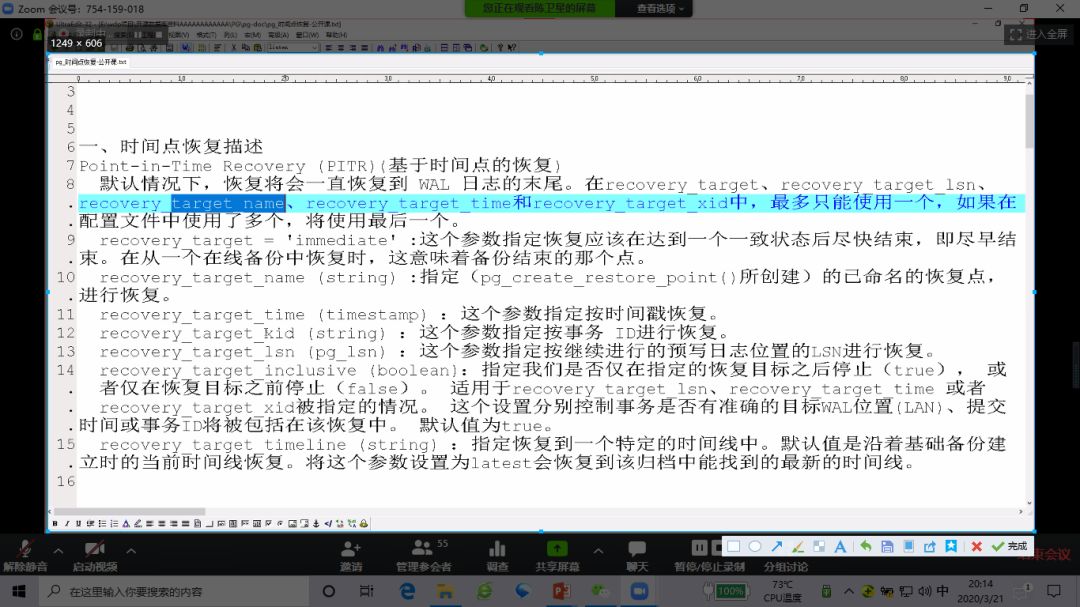 1. 陈老师,您好,您今天所讲的到目前为止都是模拟一个数据库在误操作删除一些数据之后对该数据的找回操作,操作之后后面的数据都没有了,在mysql中,我们可以在从库上设置一个sql_delay 参数,如果在规定时间内可以在从库找回数据,不影响业务的连续性,在PG里面有这些参数吗?还有你介绍的备份都是物理备份,但是在我们实际工作中都会定期对数据库进行一次逻辑备份,逻辑备份可以顺便检测一下是否有数据坏块,您觉得PG有这些优势吗?我不太了解PG,所以请教一下Mysql的sql_delay参数只是查看当前备库延迟了多少时间,不是设置需要延迟多长时间,关于使用主备延迟的方式来实现表的恢复是不太实际的,谁都不知道删除的操作什么时候会发生,什么时候知道表被删除了;Pg支持主备之间的延迟操作;我上上周做了备份恢复的公开课(包含逻辑备份和物理备份,并不是只是物理备份),逻辑备份和物理备份这两种备份是互相配合使用的,pg也是支持的。2. 有个不清楚的问题,就是执行不完全恢复前做了全库备份,执行完不完全恢复后,我能不能恢复数据库到不完全恢复前的状态3. 是否有通过某个sql语句,快速定位日志的方法呢?有第三方的软件可以把pg redolog解析成sql语句,但是也是需要通过很多日志去分析,因为你不知道需要的sql语句具体包含在哪个日志中。如果你知道做这个事务时的事务号,那么就能够很快查到,否则一个日志中包含那么多的事务,你很难去判断;如果不是做drop操作,那么可以通过对象的oid号很快在日志中定位需要关注的对象,但是这个对象可能会有重复的操作,所以还是需要人为的去判断具体哪一步是自己需要的。备库肯定是只读的,否则就无法实现主备的数据同步了,能够做恢复是因为数据库在recovery状态,可以应用日志,但是不能手动修改,数据库必须要这么设计的。如果需要做双活,那么需要第三方的同步软件才能够实现。6. PG能不能自由选择timeline,或者说能不能查看到所有的timelinetimeline是由于不完全恢复造成的,不是我们去选择哪个timeline,只要做了一次不完全恢复,就会产生新的timeline,每次发生不完全恢复后,在日志的序列号上就会产生新的timeline的标记。7. 问下金融类系统联机业务库空间多大性能不会下降,oracleRAC可以很大的库,pg做了很多分库,一个库可以到多少性能也没有大的下降;pg数据库的恢复速度怎么样,针对大库你说的大库应该指的是业务量吧,即使数据库数据再多,没有业务也不会出现新的性能问题,Oracle是oltp支持最好的,pg在oltp上也支持,目前也有金融业使用,但是没有具体的测试数据报告,所以这一方面我也不是很清楚;pg的恢复速度如果指的是recovery速度,那么在recovery的时候还是很快的,这一点跟oracle差不多。但是如果是进行restore操作,pg在大数据库下恢复应该没有oracle快,因为pg一般都是一个表一个文件的方式进行存储,那么在restore过程中有多少张表就要创建多少个文件,根据我以往的恢复经验,创建小文件的时候是需要花费很大时间的。