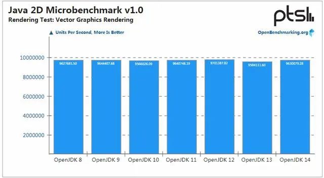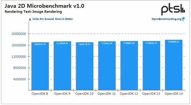 而在 Java 2D 的图像渲染性能方面,它们的水平基本保持一致,但是 OpenJDK 14 以微弱的的性能优势成为了最好性能的那个。