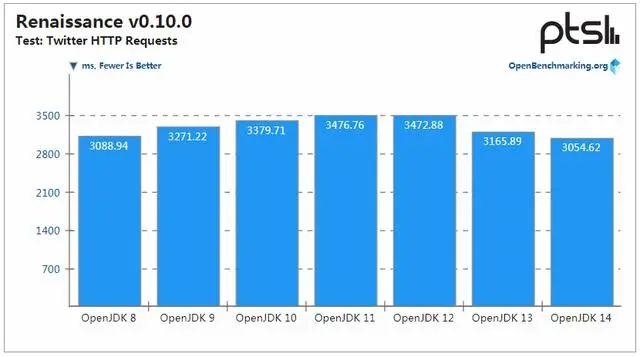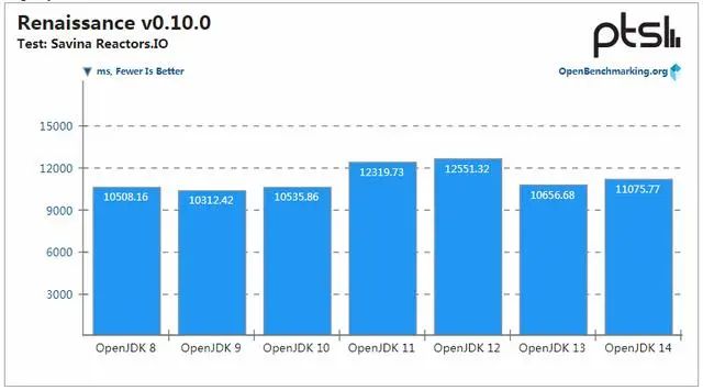 在其他一些 Renaissance 基准测试中,OpenJDK 11〜12 的性能反而最差,而 OpenJDK 14 提供的性能与 OpenJDK 8 类似。