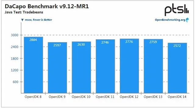 在运行 Daytrader 基准测试的 Tradebeans 测试中,OpenJDK 14 再度以微弱的优势拿下最佳的成绩。