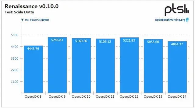 就像打乒乓球一样,Renaissance 的 Scala Dotty 基准测试提供了一个类似的例子,说明 OpenJDK 的性能也会上下波动。在此次测试中,OpenJDK 14 又比最近的版本好一些。