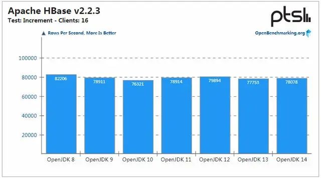 通过观察使用 Apache HBase 进行的这几个基准测试,可以发现 OpenJDK 8 运行最快,或者这几个 Java 版本的性能基本持平。